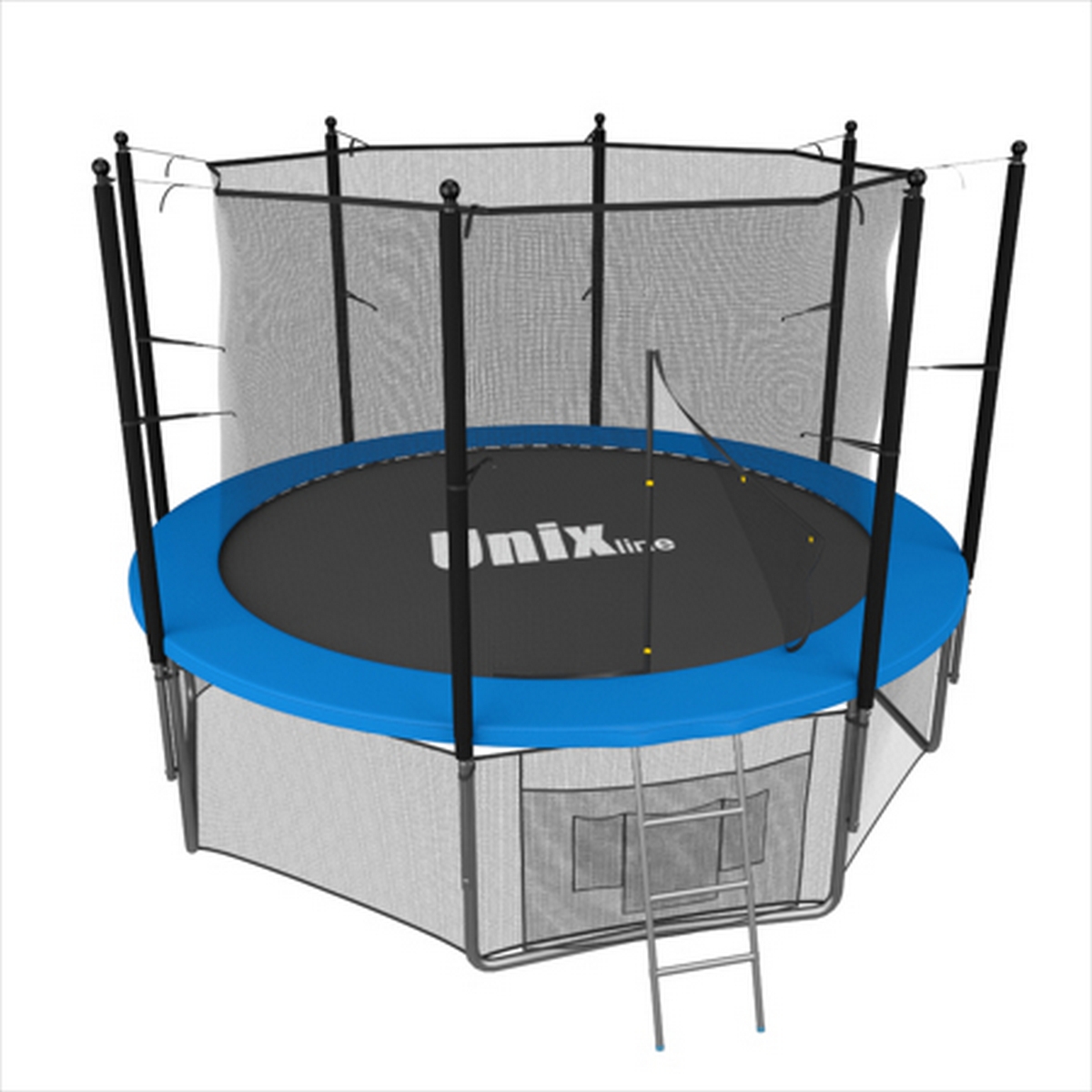 Помимо верхней защитной сетки, все батуты модельного ряда UNIX line оборудованы нижней защитной сеткой, которая препятствует проникновению под прыжковое полотно батута детей, животных, а так же попаданию посторонних предметов, и лестницей для удобства пользования. А в моделях диаметром от 10FT (305см.), в комплект входят специальные крепления батута к земле (колышки).