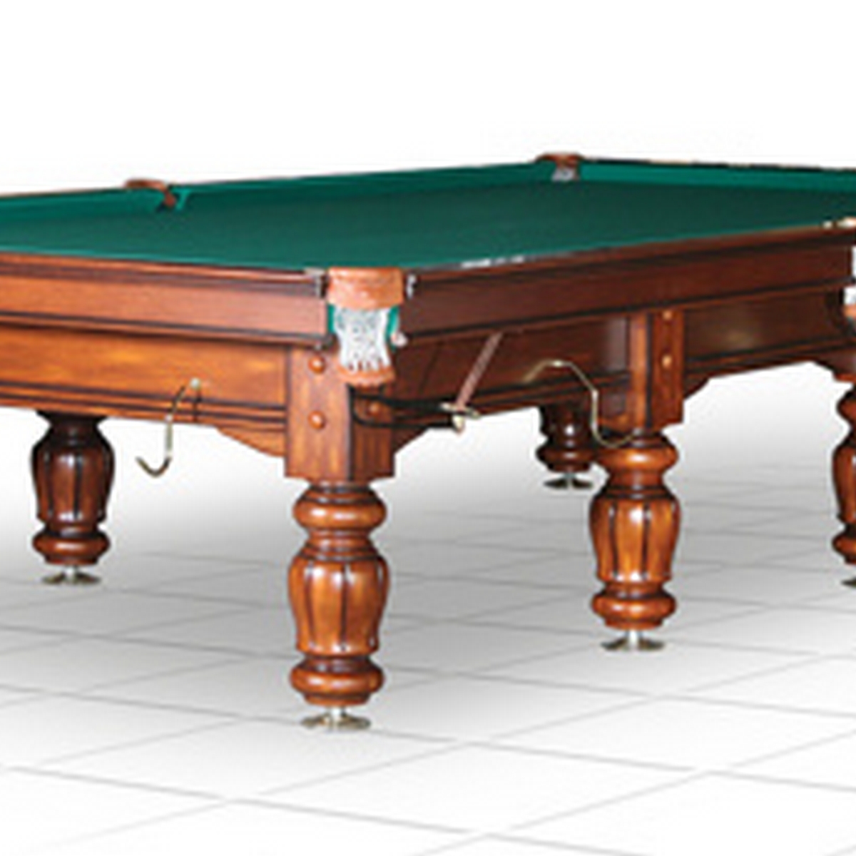 Бильярдный стол классического дизайна для пирамиды. Конструкция стола включает в себя ряд новейших разработок, используемых в производстве бильярдного оборудования, что поднимает эту модель на новый уровень качества, долговечности и профессионализма: 1. Рама и ножки стола изготовлены из переклеенных брусков твердых пород дерева, что обеспечивает прекрасную жесткость и отличную устойчивость к перепадам температур. 2. Каждая из ножек крепится к боковой части рамы (царге) двумя болтами, снабженными шайбами специальной формы, которые не позволяют каркасу стола расшатываться в процессе эксплуатации. 3. Ширина борта, изготовленного из массива твердых пород дерева, увеличена с распространенных 90 мм до 100 мм, а длина крепежного болта до 120 мм., что позволяет игроку полностью контролировать траекторию движения шаров. 4. Стол оснащен лузами с выкатом со скобами специальной конструкции, обеспечивающие их прочность и износостойкость. 5. В ножках стола установлены металлические домкраты с болтом увеличенного сечения и длинной втулкой, позволяющие регулировать высоту бортов в более широком диапазоне. «Classic II» на протяжение многих лет остается самым популярным столом среди любителей и профессионалов бильярда. Тип игры: Пирамида Основа игрового поля: Ардезия Толщина плит, мм: 45 мм из пяти частей Цвет: орех,выбрать цвет Бортовая резина: DBO Speedball Сукно: Iwan Simonis (желто-зеленое) Лузы: латунь, кожа, лен (с выкатом) Диаметр шара, мм: 68 Минимальные размеры помещения, см: 685 х 505 Вес: 1144 кг Размер: 12 футов