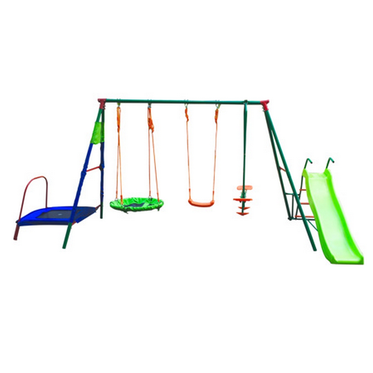 В комплекте: верёвочные качели, качели-качалки для двоих, качели-гнездо, горка и мини-батут.