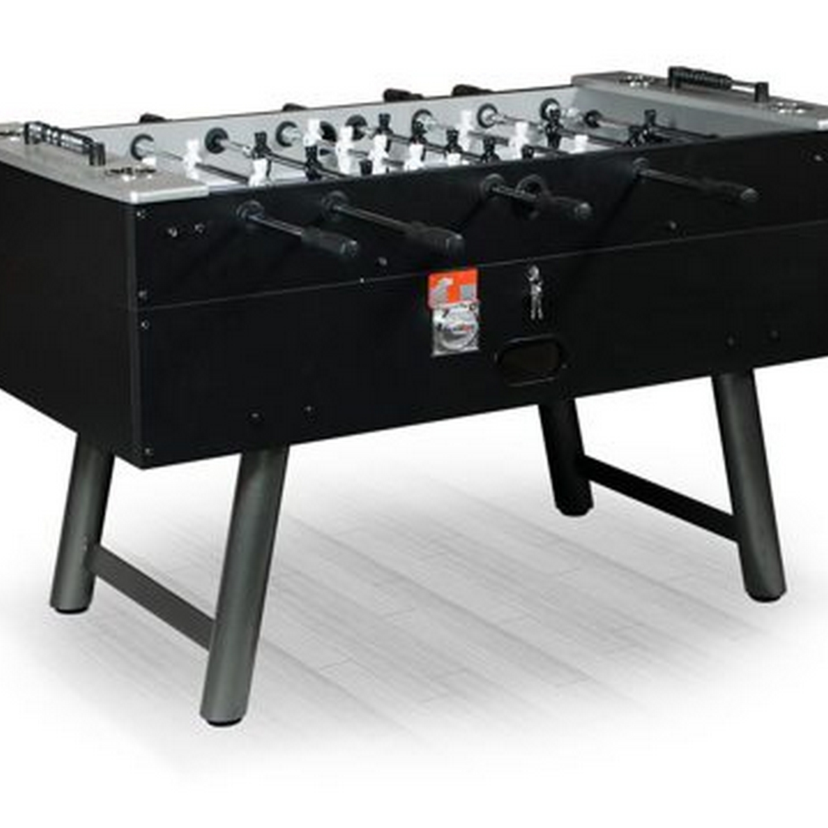 Тип игры: кикер Цвет: Черный Вес: 83 кг Размер: 145х75х86 см Упаковка: 147x83x45, 90 кг Ноги: Ф 75 мм металл Штанги: Ф15.8 хром Мяч: АЕ-02 (15шт Ф36мм) Игровое поле: 1170х680х9мм MDF Стол идеально подходит как для коммерческого, так и домашнего использования. Ноги изготовлены из нержавеющей стали, и снабжены системой домкратов, что позволяет установить стол на неидеально ровной поверхности. Игровое поле выполнено из ударопрочного материала, усиленного стекловолокном, что придает ему дополнительную стойкость к царапинам. Традиции испанского футбола-эмоциональный, взрывной характер игры в сочетании прагматичностью с нацеленностью на результат-именно это выделяет эту модель из всех остальных. Конструкция усилена металлическими стержнями, придающими дополнительную жесткость. Ручки выполнены из каучука, что гарантирует отличный контакт с ладонями. Так же стол оснащен программируемым жетоноприемником, в комплект входят 50 жетонов. Инструмент для сборки, а также запасные мячи для игры прилагаются. Размер стола-145х75х86 см, размер игрового поля-117х68 мм, вес-83 кг.