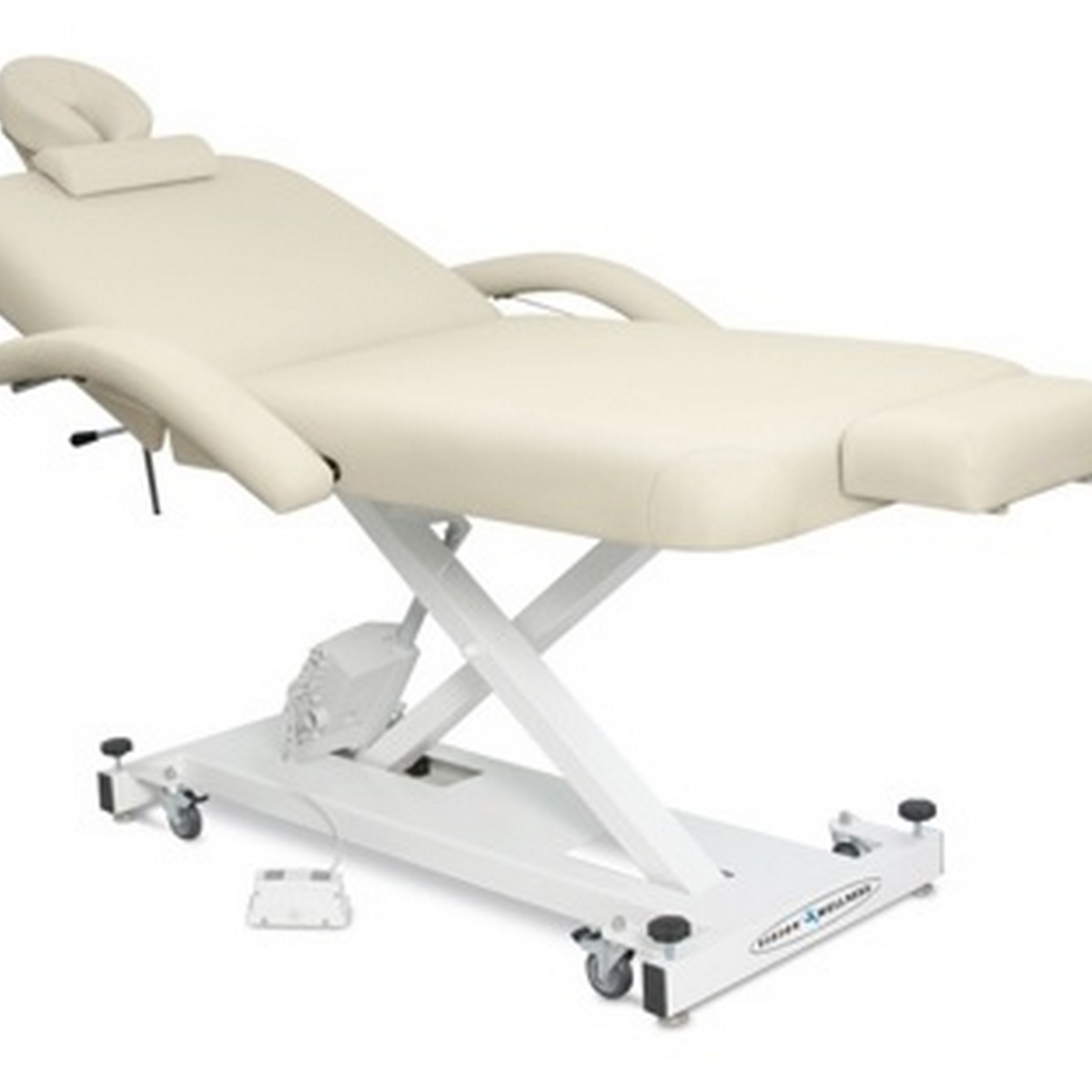 Прочность и устойчивость конструкции обеспечиваются сварной рамой формы "Х" с толщиной стального листа 3 мм. За вертикальный подъем отвечает мощный и надежный двигатель производства компании Linak (Дания), максимальный вес пользователя составляет внушительные 220 кг. Рабочий диапазон высоты ложемента варьируется от 53 до 99 см. Секции спины регулируются механическим способом в диапазоне от 0 до 75 градусов. Дополнительный комфорт обеспечивают регулируемый в двух проекциях съемный подголовник и съемный валик для ног. Транспортировка стола предельно проста благодаря транспортировочным роликам. Отдельно стоит отметить целых два механизма фиксации - на роликах и на раме, причем второй используется также для горизонтального выравнивания положения стола. Размер изделия в горизонтальном положении без опций - 184*73*53/99 см.