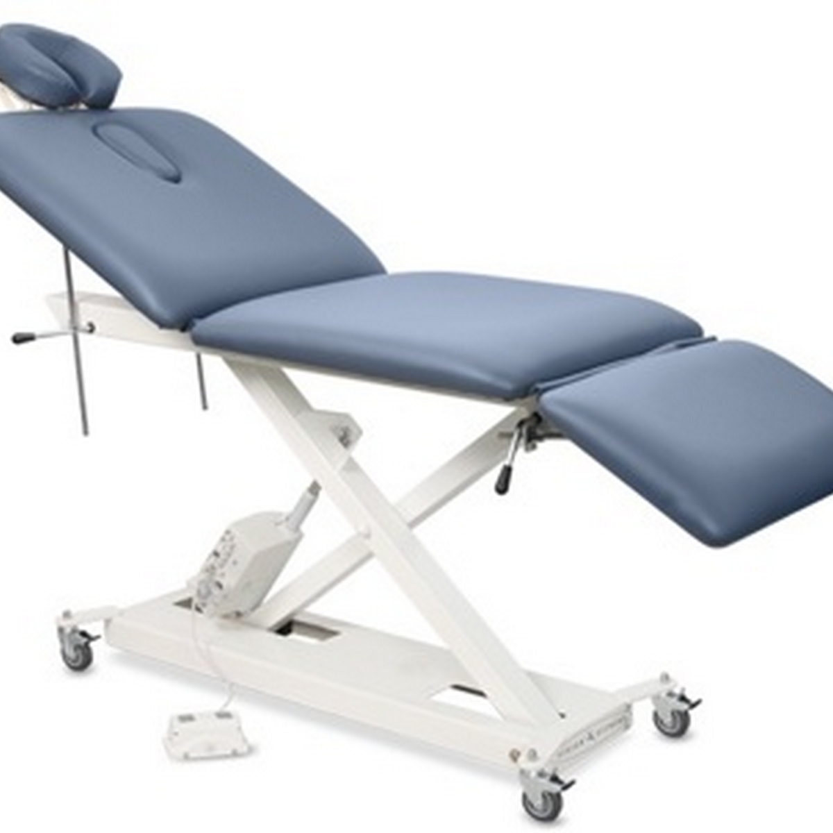 3-ех секционный массажный стол с электроприводом. Прочность и устойчивость конструкции обеспечиваются сварной рамой формы "Х" с толщиной стального листа 3 мм. За вертикальный подъем отвечает мощный и надежный двигатель производства компании Linak (Дания), максимальный вес пользователя составляет внушительные 220 кг. Рабочий диапазон высоты ложемента варьируется от 52 до 98 см. Секции головы и ног регулируются механическим способом, центральная секция фиксированная.
