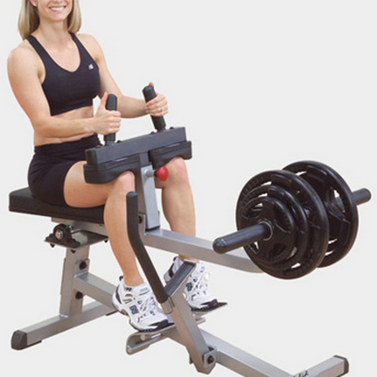 Тренажер для развития мышц голени из положения сидя. Нагрузка увеличивается втрое за счет рычага. Регулируемое стартовое положение для удобства любого пользователя. Упор для ног под углом с нескользящим покрытием. Система обеспечения плавного хода даже при максимальных нагрузках. В качестве отягощения используются диски 51 мм. и 26 мм.