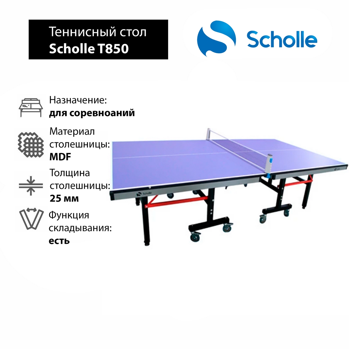 Высококачественный теннисный стол Scholle T850 сделан по последним технологиям и предлагает максимальную функциональность и удобство использования. Столешница состоит из 25 мм качественного МДФ материала с антибликовым покрытием, который имеет высокую прочность и влагоустойчивость, а также обеспечивает великолепный отскок теннисного мяча профессионального уровня. При этом материал является экологичным, что важно для использования внутри помещений.