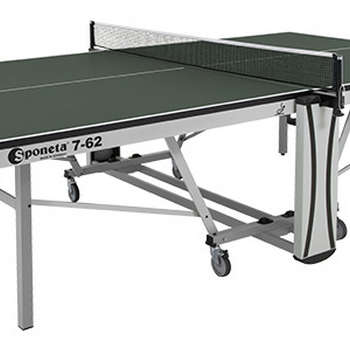 Стол Sponeta S7-62 имеет компактную систему складывания (тип 4b) и встроенную сетку, одобренную ITTF. Это особенно удобно для нестационарных залов, где столы приходится ежедневно складывать и раскладывать, снимать и ставить обратно сетку. Ножки стола Sponeta S7-62 снабжены устройством для горизонтальной юстировки положения стола в разложенном состоянии в диапазоне до 25 мм.